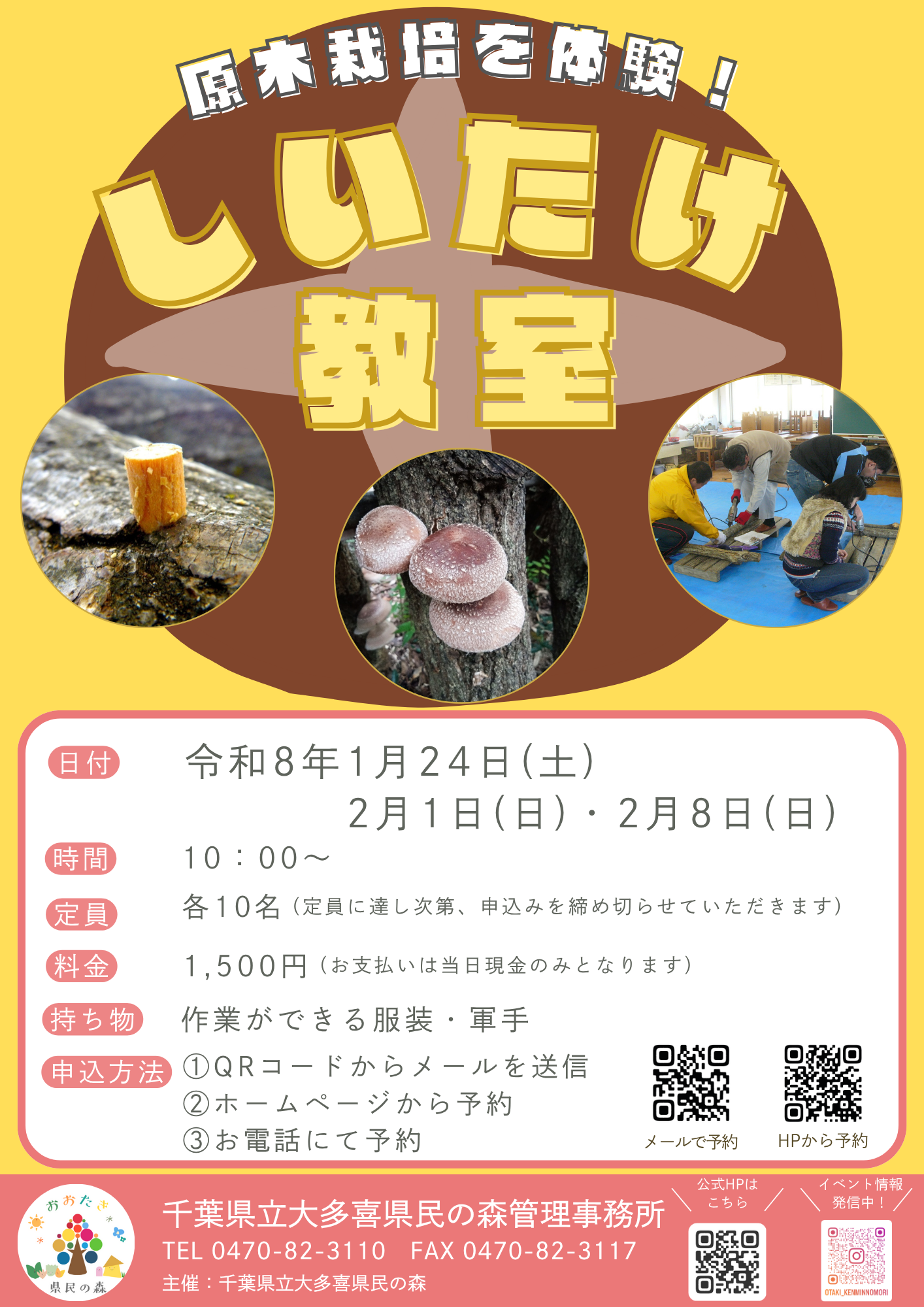 大多喜県民の森で、1月24日(土)・2月1日(日)・2月8日(日)に「しいたけ教室」を開催します。