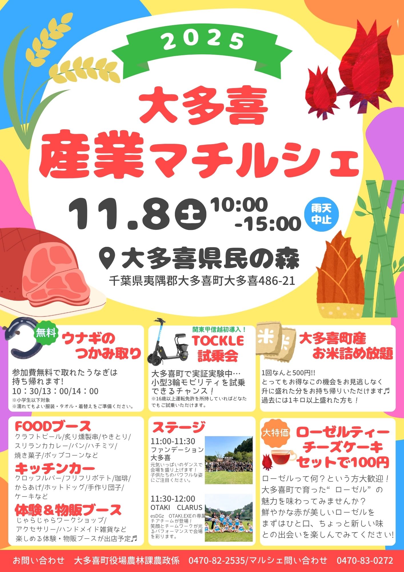 大多喜産のお米詰め放題や、子ども向けの「ウナギのつかみ取り体験」など、体験型コンテンツも充実。