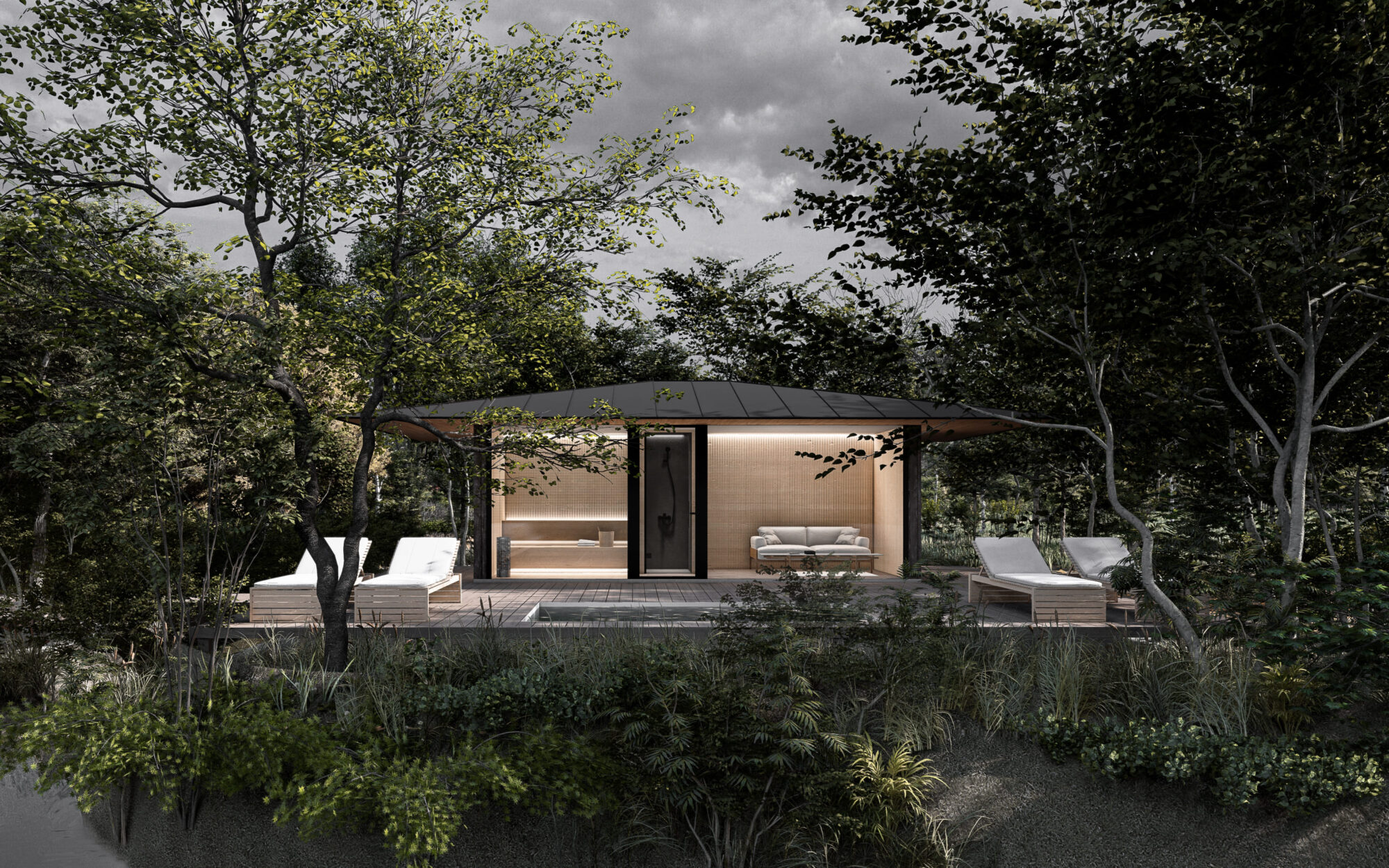 サウナ後はフルフラットになるサンベッドで星空や野生動物を眺めながらゆったりとお寛ぎいただけます。
