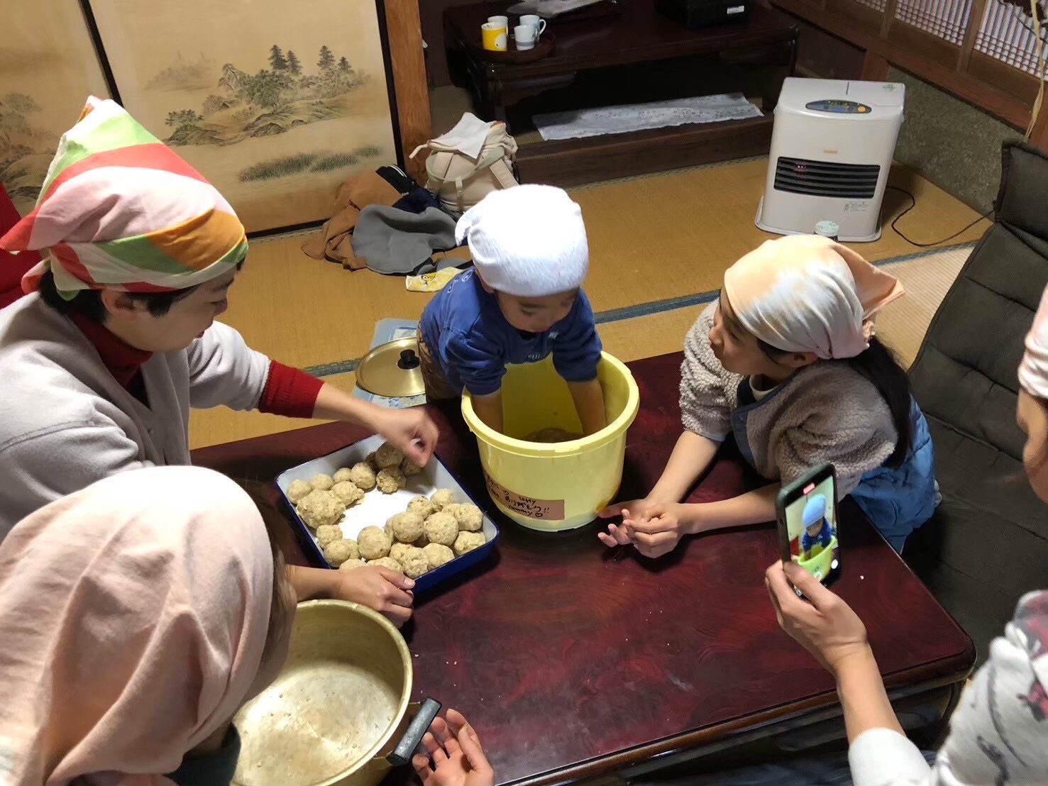 大豆は、薪を使った焚火でじっくりと茹でて柔らかくし、人の手で潰して合わせていきます。