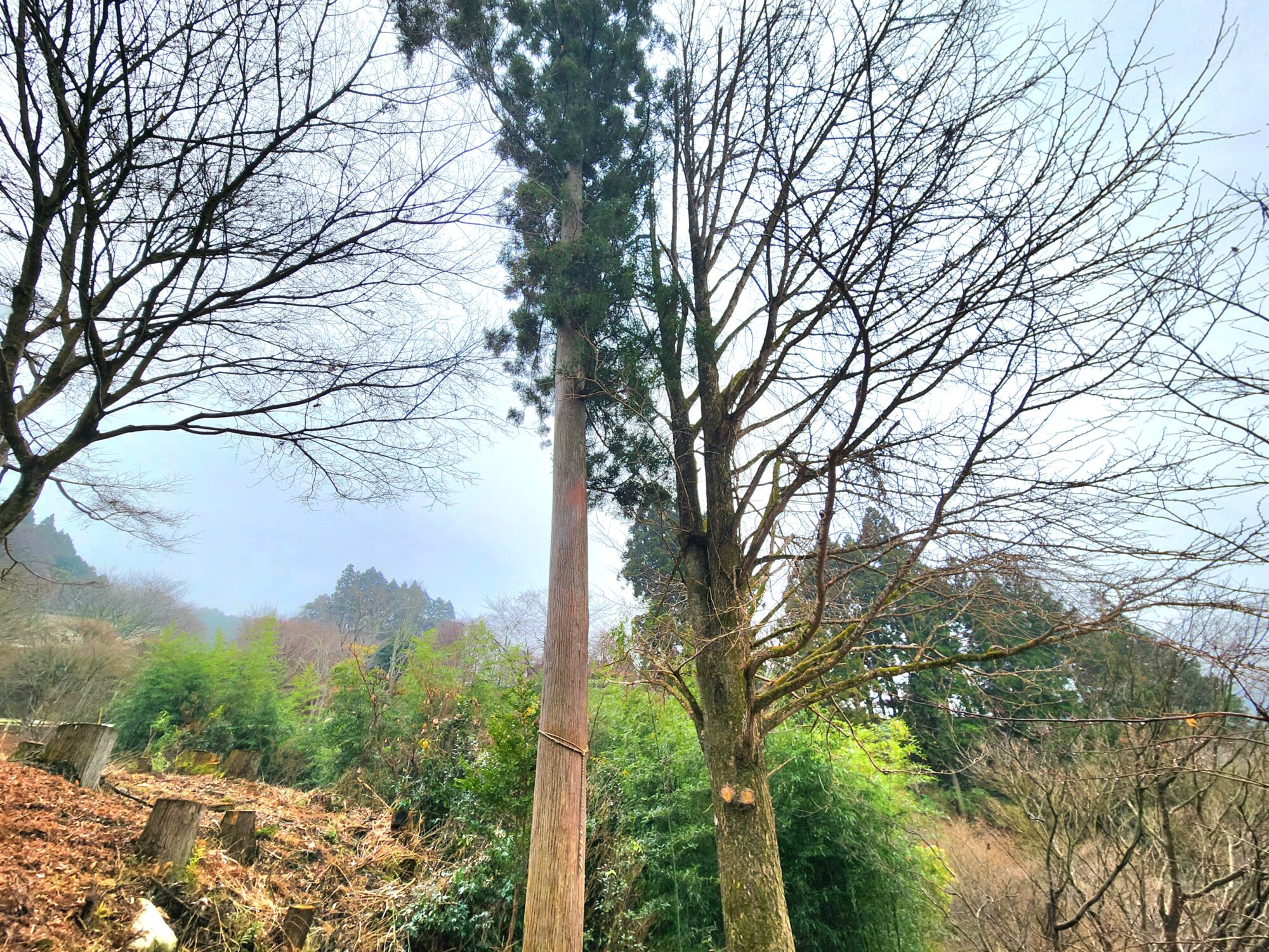 駐車場の中腹には、動植物が共生する森の象徴として、種類を超えて寄り添い立つスギとイチョウの御神木が。
