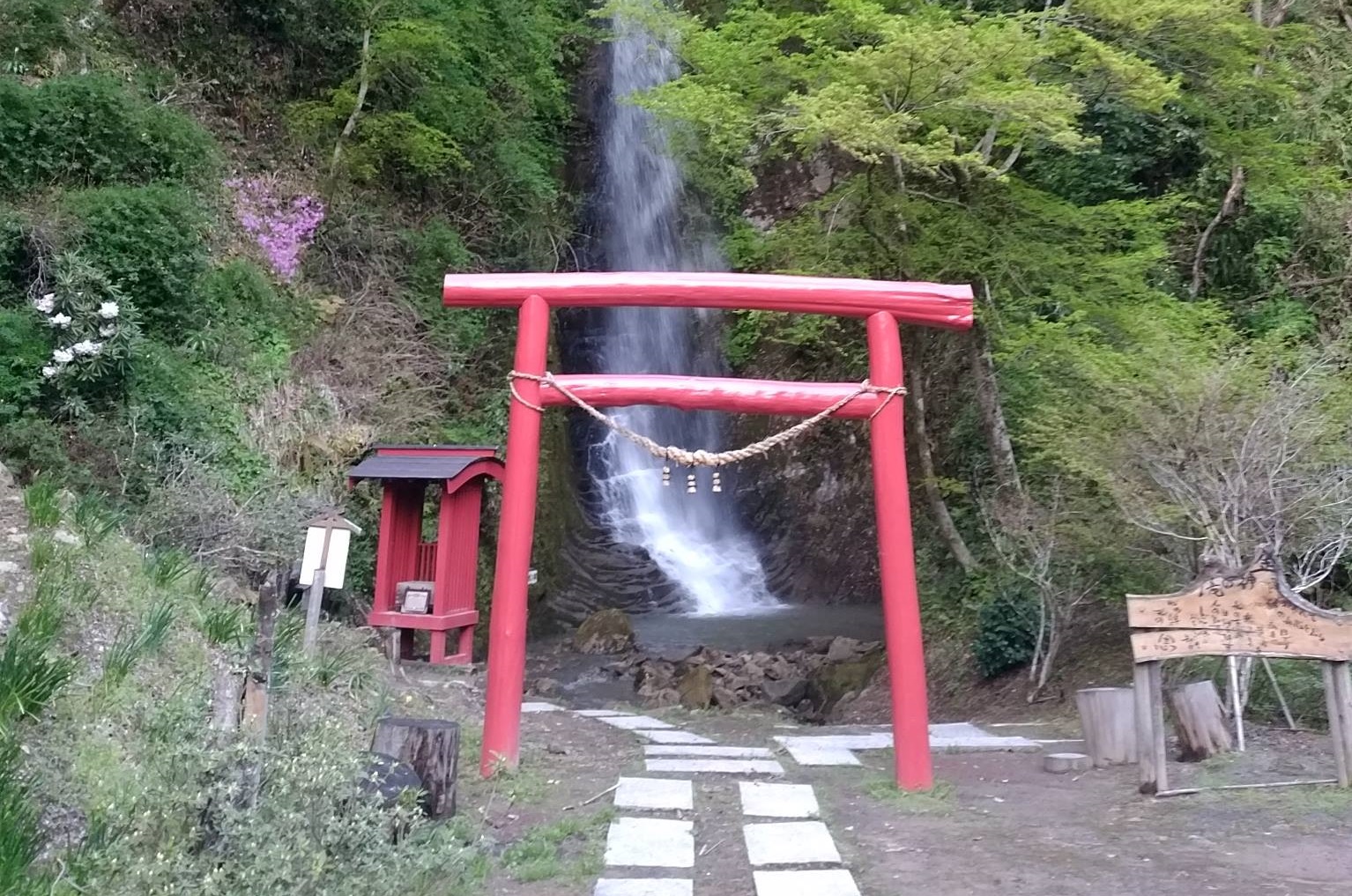 赤い鳥居をくぐると荘厳な滝つぼが現れ、鎮座する三体の神(水の神・日の神・土の神)が微笑んでいます。