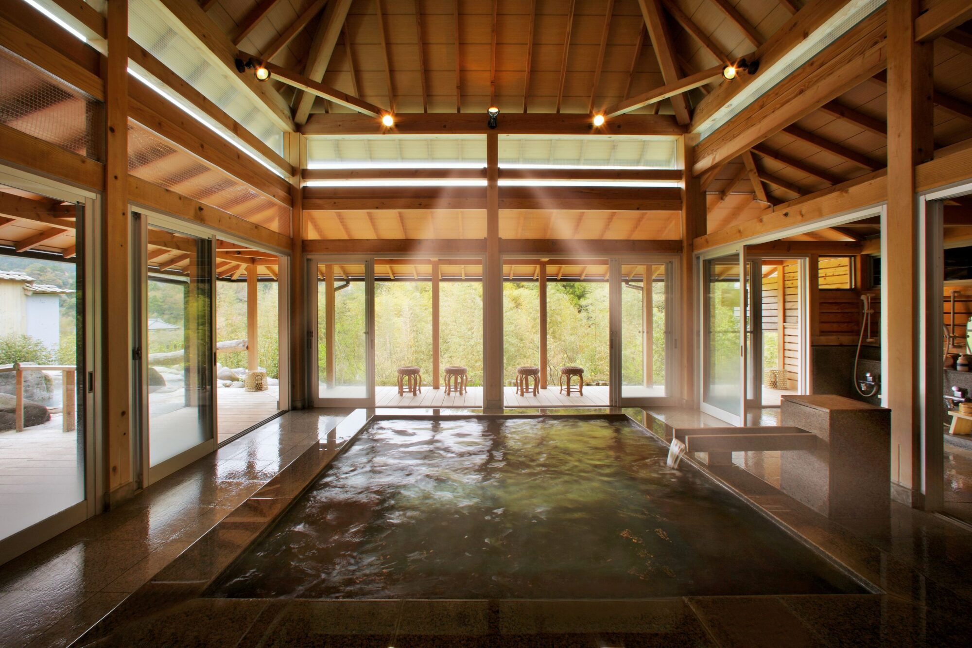 自然につつまれるような露天風呂では、渓谷の木々に囲まれながら、四季折々の風景を眺めてゆったりと湯浴みを。木のぬくもりが心地よい内風呂も、自然と調和した落ち着いた空間で、静かな時間が流れます。泉質は「美肌の湯」としても評判です。