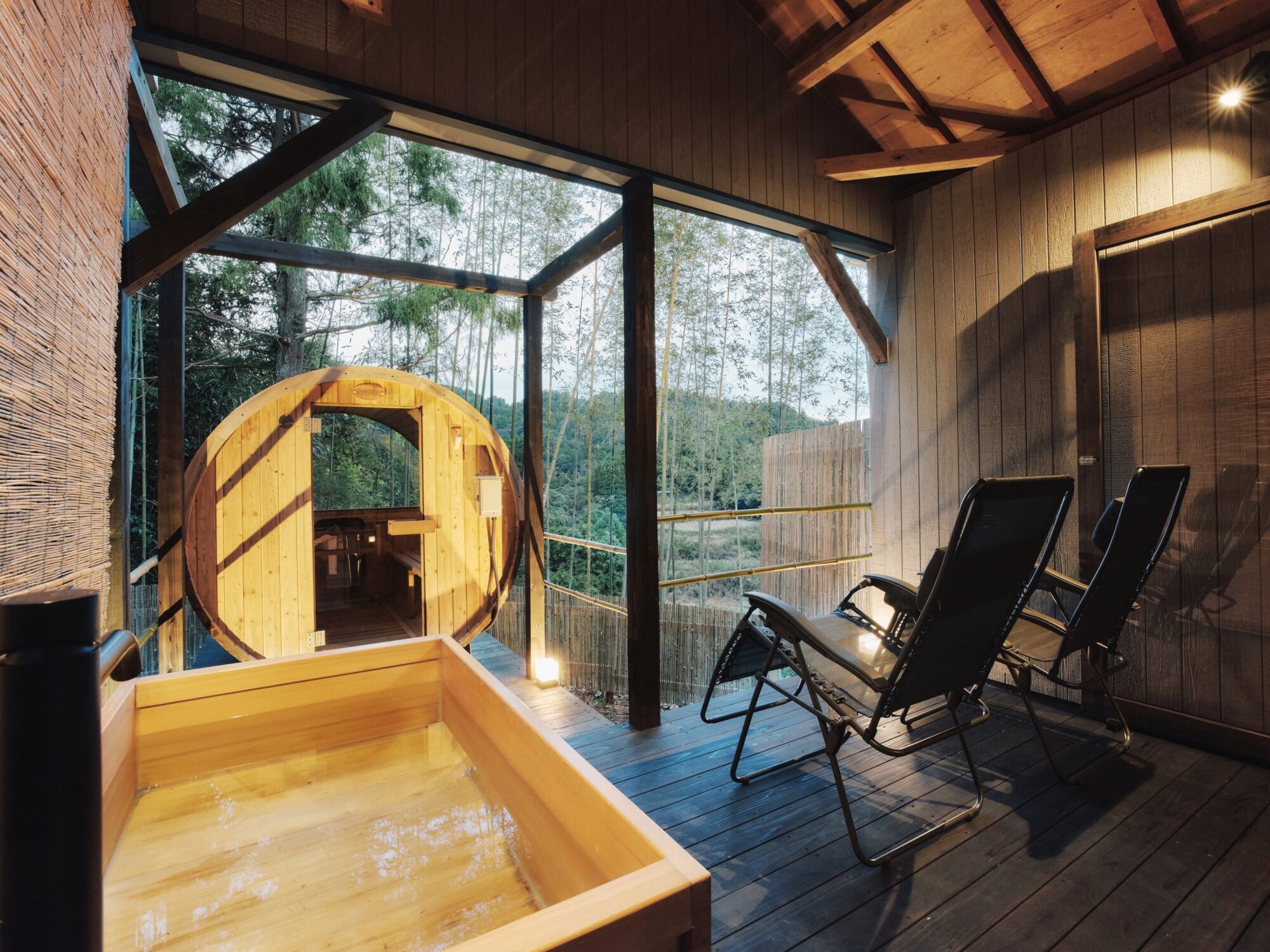 川のせせらぎが聞こえる緑深い里山を望む、自然に囲まれた癒やしゾーン。サウナ・水風呂・浴室をテラスで繋いだプライベート空間。